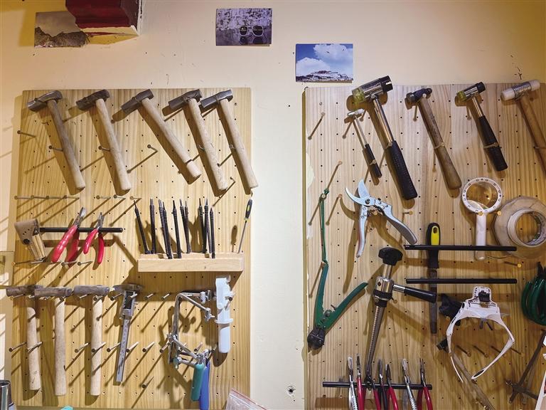 步入堯西平康古建大院,陽光灑落,透過蘋果樹與核桃樹的葉縫,投下片片陰涼,在樹下落座,幽思與怡然不禁飄然而至。耳邊偶爾會傳來陣陣“叮叮當(dāng)當(dāng)”清脆悅耳的敲打聲。聲音源自物喜手工工作室,工作室主理人是42歲的霍志勇,一位將激情與心血全部傾注在打銀工藝中的匠人?;糁居侣镁游鞑?2年,自2018年在云南學(xué)習(xí)了銀飾制作技藝后,便回到拉薩致力于探索當(dāng)代元素與傳統(tǒng)藏式風(fēng)格結(jié)合的手工銀飾制作。