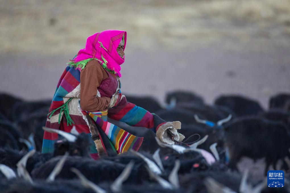 措勤縣紫絨山羊原種場(chǎng)的一位牧工在照看優(yōu)質(zhì)種羊群(11月20日攝)。新華社記者 姜帆 攝 ??
