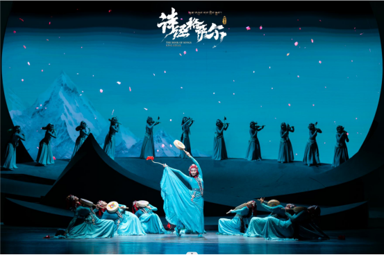 在創(chuàng)作過程中,團隊深度挖掘《詩經(jīng)》和《格薩爾》史詩經(jīng)典代表作品的文化元素,在“同、融、美”方面狠下功夫。主創(chuàng)們深入挖掘兩部作品中相同、相似、接近的圖騰、樂器、歌舞、生活習(xí)性等文化元素 ,以《詩經(jīng)》采詩官與《格薩爾》史詩傳唱藝人作為明線,將“火、水、結(jié)”作為暗線,將這些文化元素有機串聯(lián)起來,再借助高科技數(shù)字手段呈現(xiàn)背景影像,實現(xiàn)了在“美美與共”的欣賞中,讓觀眾感知中華多民族文化的交往交流交融,表達(dá)了中華文化同宗同源的歷史,有力體現(xiàn)了多民族共鑄中華民族共同體意識的主題。