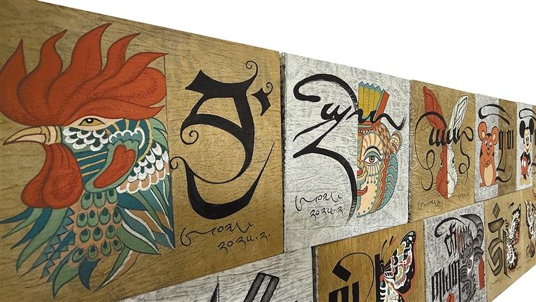 在昂桑的工作室中,《一日一畫(huà)》系列尤為醒目:藝術(shù)家采用布面重彩技法,讓唐卡礦物顏料與現(xiàn)代丙烯顏料滲透交融,傳統(tǒng)吉祥紋樣與幾何抽象圖案共生。韓書(shū)力評(píng)價(jià):“他讓千年顏料與當(dāng)代審美共振,完成傳統(tǒng)藝術(shù)的‘基因重組’?!?/p>