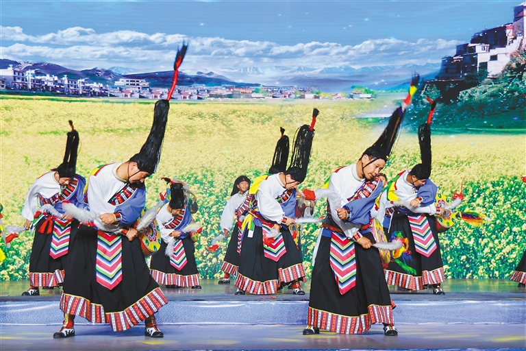 說唱《聲生不息》以鏗鏘有力的節(jié)奏,再現(xiàn)世界最長史詩《格薩爾王傳》中降魔濟世的英雄傳奇;舞蹈《達姆韻》以工布響箭舞步、熱瑪琴伴奏,將對生活的熱愛、對自然的敬畏,化作熱烈奔放的舞步,演繹著傳承千年的文化記憶,彰顯著工布獨特的生命張力與文化自信;《扎西央恰》將千年宣舞與噶爾舞創(chuàng)新融合,以莊重舒緩的舞步訴說著高原先民對天地的敬畏,以雄渾激昂的鼓點展示雪域歷史的風云激蕩,在莊重與激昂中訴說阿里高原的歷史變遷……