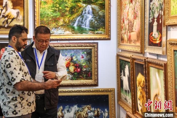 圖為來自巴基斯坦的參展商在擺放地毯。中新社記者 薛蒂 攝