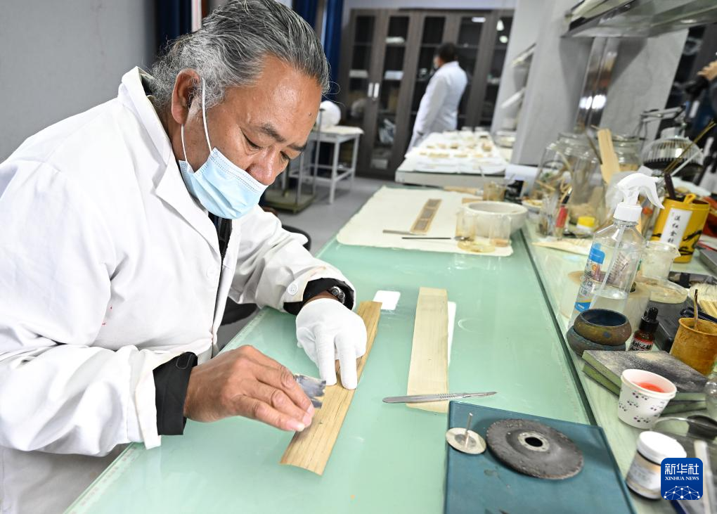 布達(dá)拉宮貝葉經(jīng)實(shí)驗(yàn)性修復(fù)小組實(shí)驗(yàn)室工作人員對(duì)貝葉進(jìn)行處理(5月25日攝)。新華社記者 李賀 攝 ??