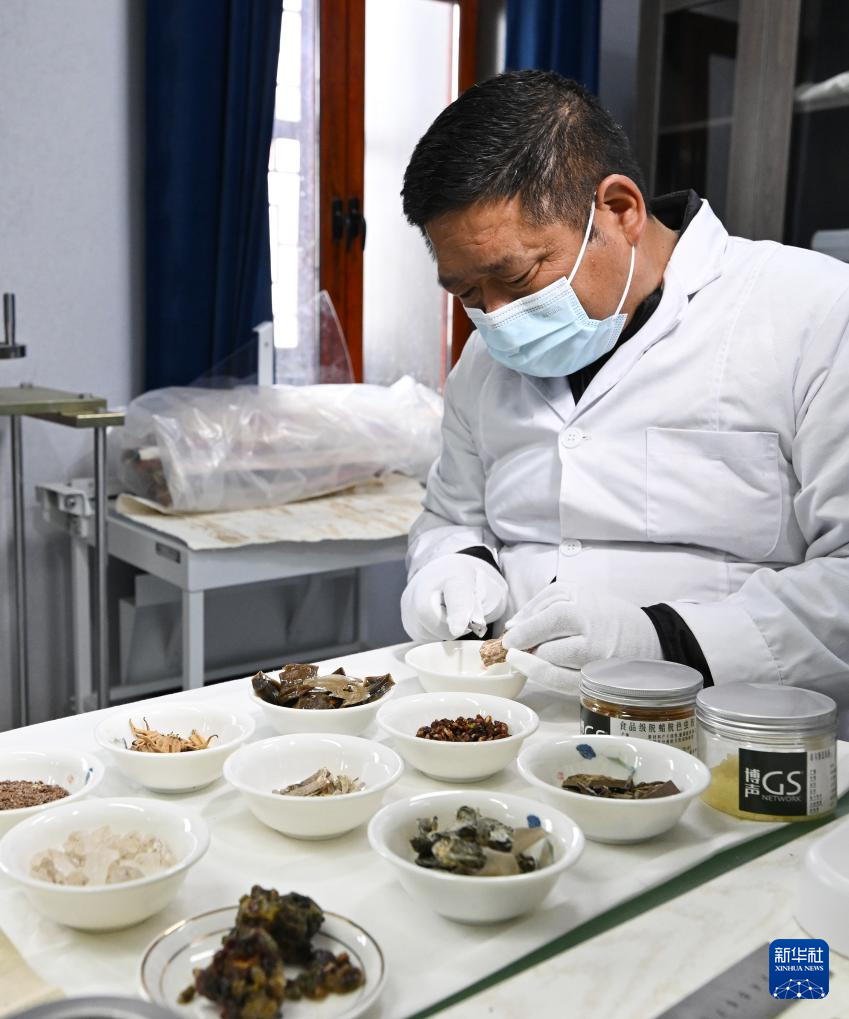 布達(dá)拉宮貝葉經(jīng)實(shí)驗(yàn)性修復(fù)小組實(shí)驗(yàn)室工作人員對(duì)用于貝葉修復(fù)的粘合劑原料進(jìn)行加工(5月25日攝)。新華社記者 李賀 攝?