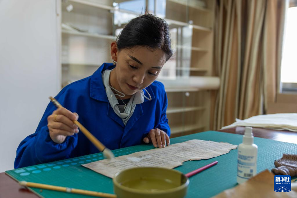 8月13日,西藏自治區(qū)古籍保護(hù)中心古籍修復(fù)員次仁央宗在對古籍進(jìn)行除霉。新華社記者 旦增尼瑪曲珠 攝 ??