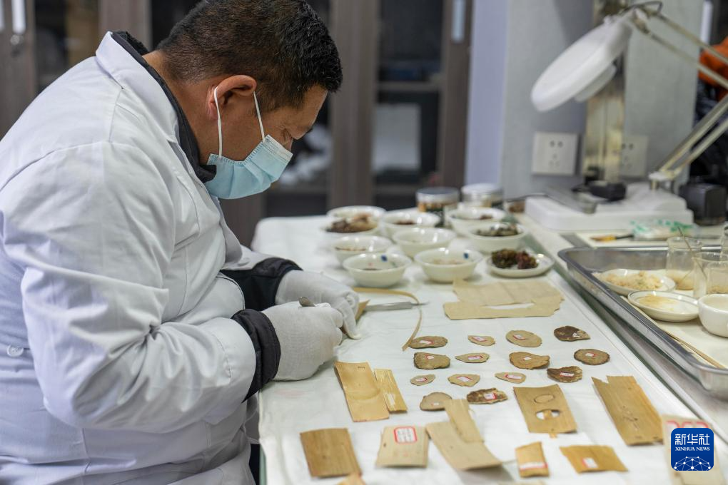 5月25日,布達(dá)拉宮貝葉經(jīng)實(shí)驗(yàn)性修復(fù)小組實(shí)驗(yàn)室工作人員在對貝葉進(jìn)行處理。新華社記者 旦增尼瑪曲珠 攝 ??