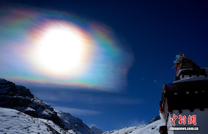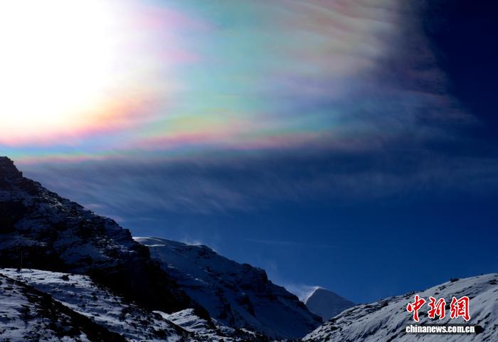 11月5日上午,西藏日喀則市崗巴縣天空中出現(xiàn)“七彩祥云”景觀。據(jù)了解,“七彩祥云”又叫“七彩云”“虹彩云”,是指太陽光線與云彩中的冰晶結(jié)構(gòu)產(chǎn)生的自然現(xiàn)象。中新社記者 李林 攝