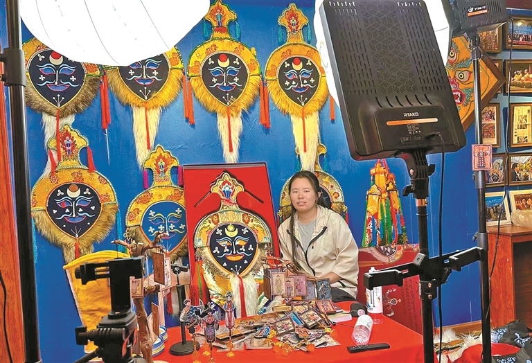 達(dá)孜區(qū)雪鄉(xiāng)阿古傳統(tǒng)藏戲服飾農(nóng)牧民專業(yè)合作社員工通過(guò)網(wǎng)絡(luò)直播,拓寬藏戲服飾銷售渠道。