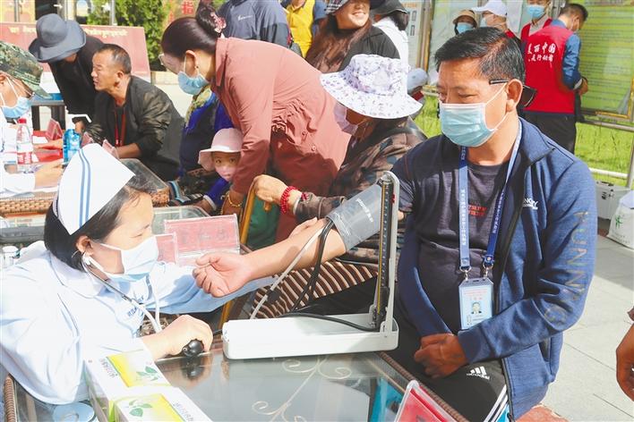 圖為武警西藏總隊(duì)醫(yī)院醫(yī)護(hù)人員為社區(qū)居民測(cè)量血壓。 金言 蔣長(zhǎng)春 攝