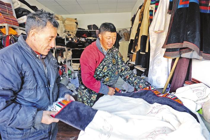 走進(jìn)位于縣城的普保鎮(zhèn)色林錯農(nóng)畜產(chǎn)品銷售基地,嘎瑪平措正在和徒弟次仁桑波制作藏裝。不大的房間里,掛滿藏裝、藏帽和羊皮襖等手工制品。