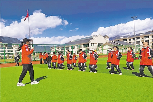 西藏林芝市巴宜區(qū)八一鎮(zhèn)團結小學操場上,來自廣東的援藏教師正在向學生教授跆拳道。經(jīng)濟日報 記者 龐彩霞