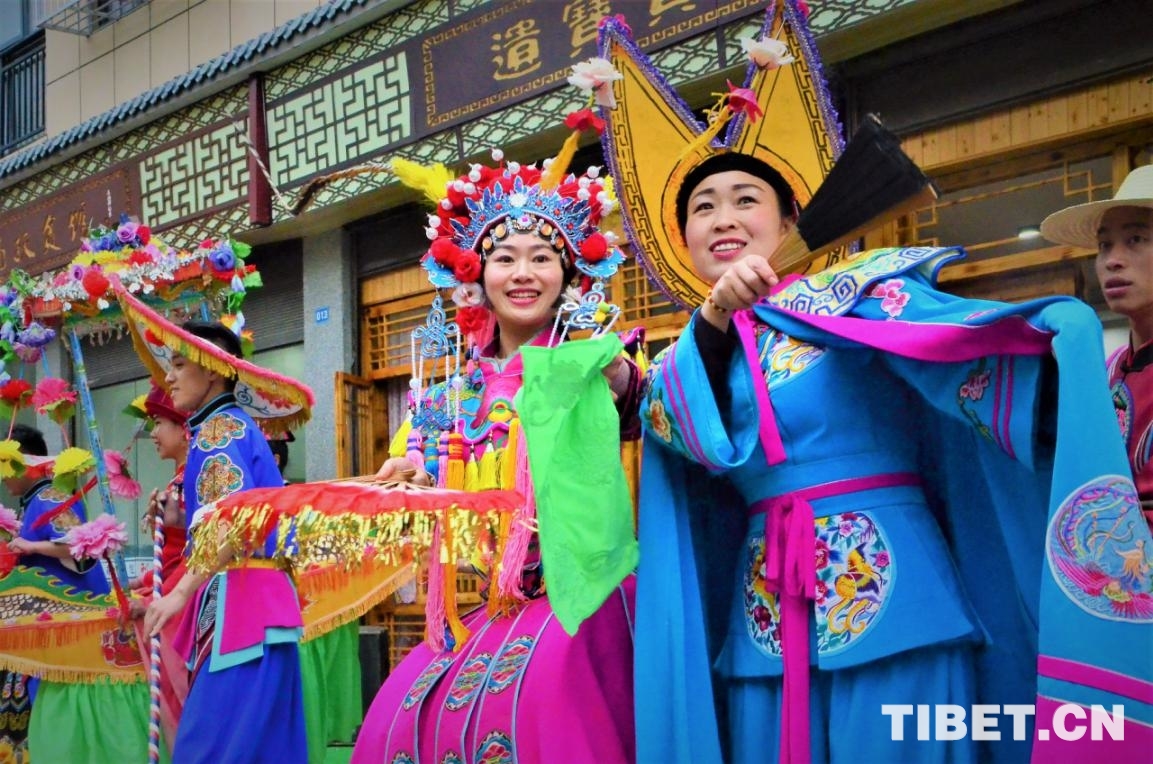 圖為譚琴琴(右二)在遺寶寶風情館前展示利川燈歌 攝影:歐帆