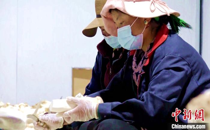 圖為11月17日,西藏日喀則市謝通門(mén)縣農(nóng)牧民在該縣一生物科技企業(yè)清理食用菌。中新社記者 貢桑拉姆 攝