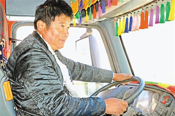 洛松新巴駕駛著自家的四橋車。