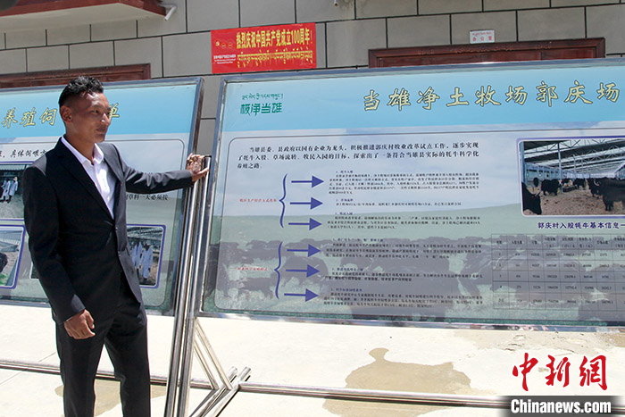 圖為6月2日,凈土牧場郭慶場負(fù)責(zé)人阿旺多布杰向記者介紹相關(guān)情況。 中新社記者 陳小愿 攝