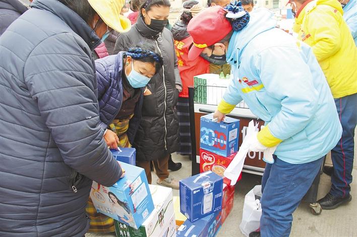 圖為中石油西藏日喀則銷售分公司日喀則市區(qū)加油站黨員為社區(qū)群眾發(fā)放慰問品。記者 索朗瓊珠 次仁片多 攝