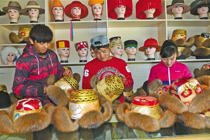 貢嘎縣朗杰藏帽合作社的員工在銷(xiāo)售藏帽。