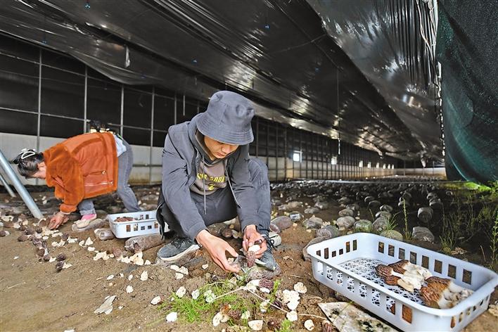 圖為索珠鄉(xiāng)種植基地工作人員正在采摘羊肚菌。記者 唐斌 丹增群培 攝