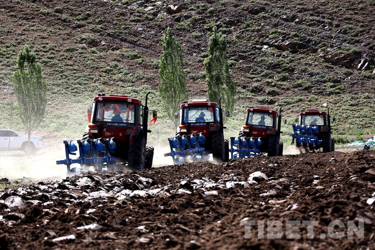圖為在曲嘎強(qiáng)村四臺農(nóng)用機(jī)械聯(lián)合作業(yè)耕種飼草 攝影:王佳豪