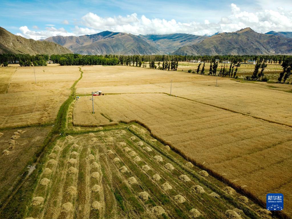 農(nóng)機(jī)合作社和收割工作隊在林周縣邊林鄉(xiāng)當(dāng)杰村玉沖組搶收小麥(無人機(jī)照片,9月6日攝)。新華社記者 姜帆 攝
