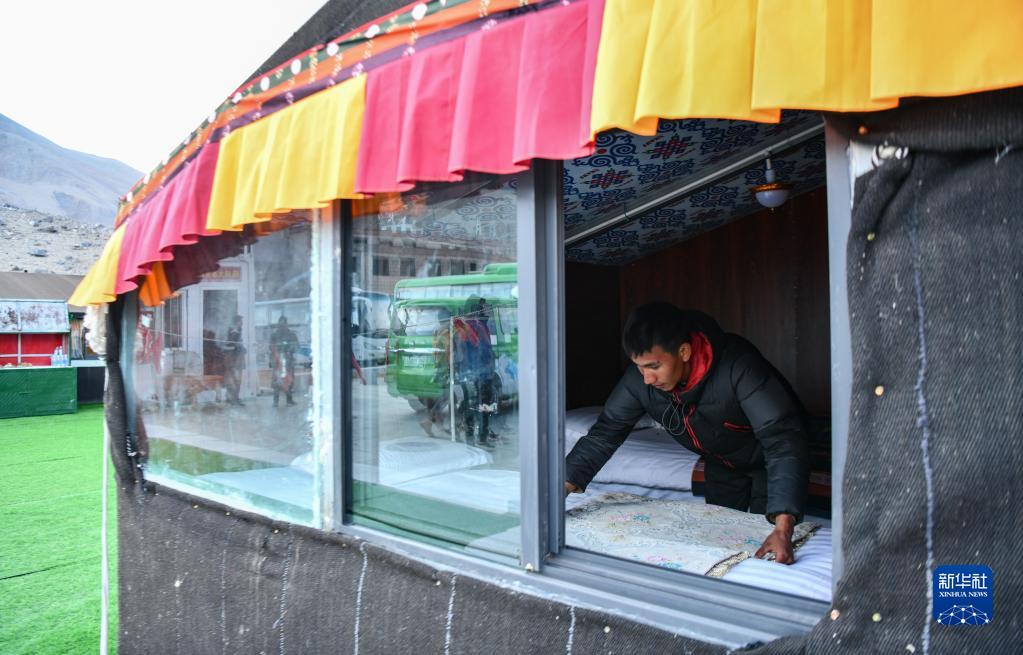 在珠峰游客大本營(yíng)的帳篷旅館,扎西次仁在整理床鋪(5月13日攝)。新華社記者 晉美多吉 攝