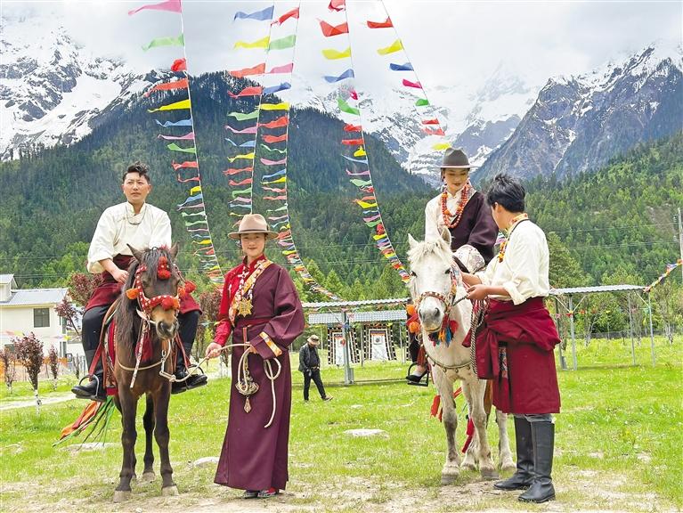 波密縣扎木鎮(zhèn)康木村坐落于318國道旁,風(fēng)景秀麗,群山環(huán)繞,很多自駕游的游客都會經(jīng)停于此體驗藏家文化。 圖為游客在康木村,穿著藏裝體驗騎馬樂趣。 圖片由本報記者 張猛 攝