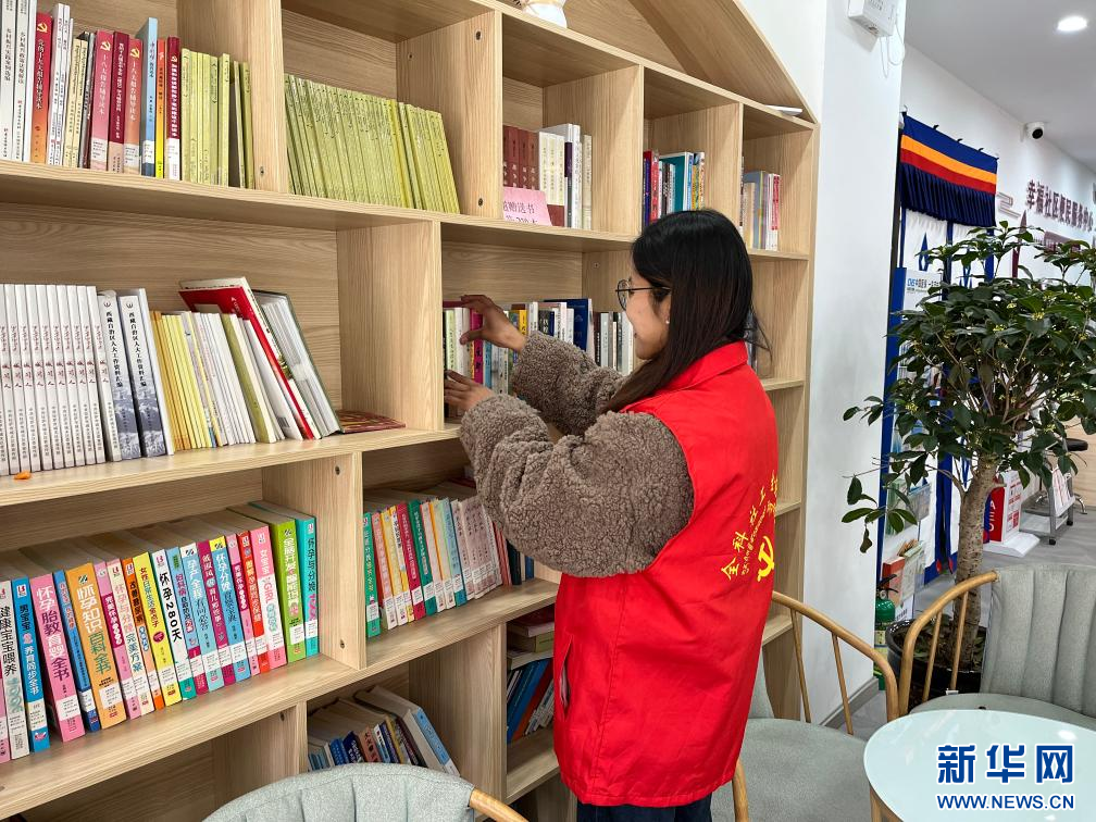 在西藏拉薩市功德林街道,幸福社區(qū)的“全科社工”強珍正在整理黨群服務中心的書籍(11月26日攝)。新華社發(fā)(德央 攝)