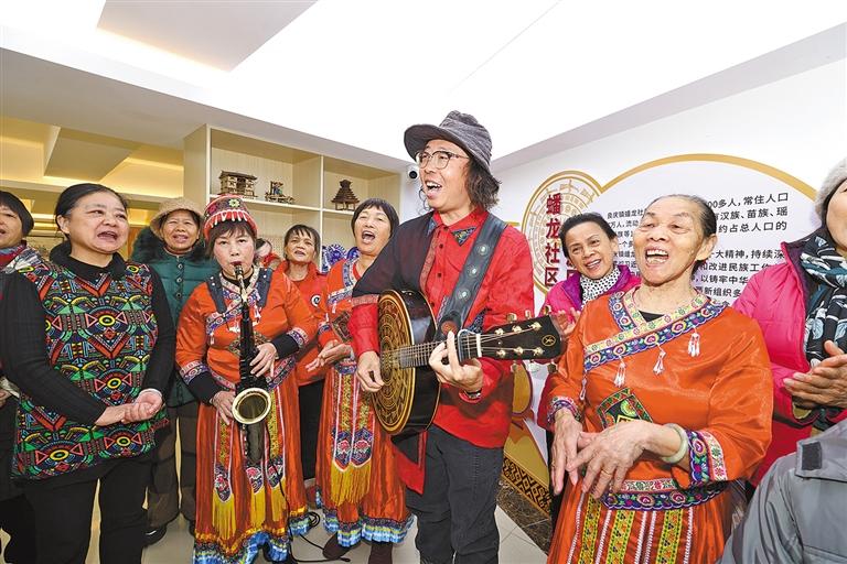 “蟠龍社區(qū)生活著漢族、壯族、瑤族等15個民族的同胞,少數(shù)民族人口約占社區(qū)總?cè)丝诘?/3?!斌待埳鐓^(qū)黨委副書記許玉君介紹說,社區(qū)結(jié)合多民族“嵌入式”居住的特點,創(chuàng)新踐行“136”工作機制,即圍繞鑄牢中華民族共同體意識這條主線,通過加強黨的領(lǐng)導(dǎo)、織牢精神紐帶、用好治理平臺“三個抓手”,積極創(chuàng)造各民族共居共學(xué)、共建共享、共事共樂的“六共”條件,讓各族群眾像石榴籽一樣緊緊抱在一起?!拔沂菨h族,會做壯族的特色菜,我愛人是仫佬族,漢字書法練得有模有樣。”蟠龍社區(qū)藝術(shù)團骨干何繼榮老人說。