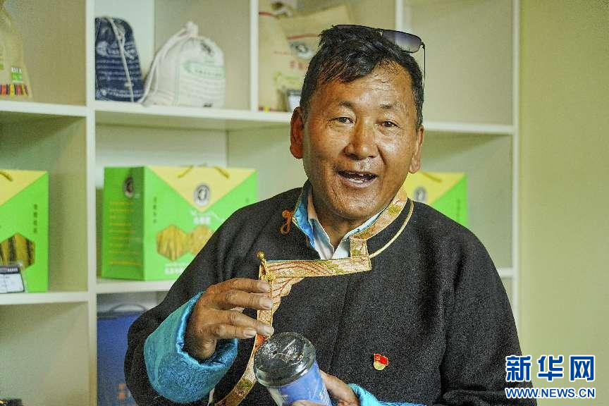 圖為申藏村黨支部書記旺扎在介紹新產(chǎn)品(9月2日攝)。新華網(wǎng)發(fā) 喬柯嵐攝