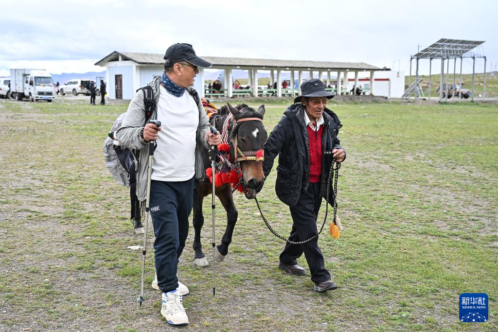 9月8日,在普蘭縣巴嘎鄉(xiāng)崗莎村,當(dāng)?shù)卮迕裾隣恐R和游客同行。新華社記者孫瑞博 攝