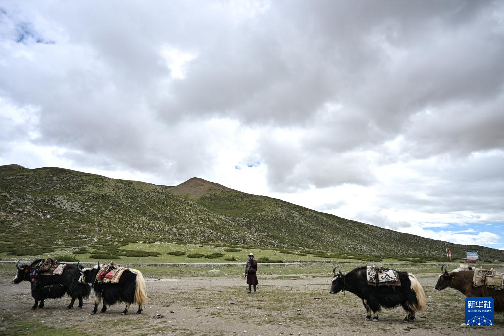 9月8日,在普蘭縣巴嘎鄉(xiāng)崗莎村,牧民正在驅(qū)趕牦牛運(yùn)送轉(zhuǎn)山游客的貨物。新華社記者孫瑞博 攝