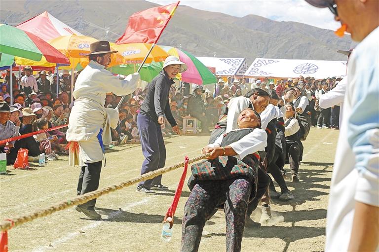 圖為農(nóng)牧民參加拔河比賽。