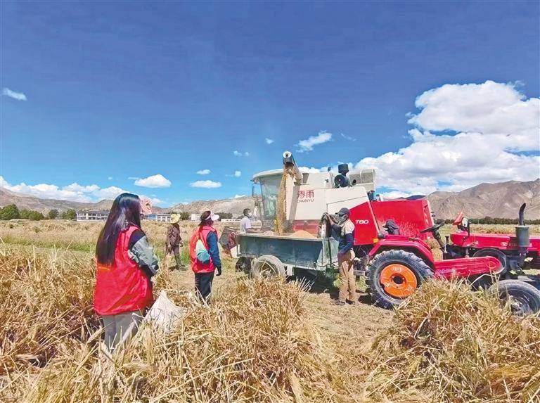 拉孜縣的志愿者在田間地頭服務(wù)秋收工作。拉孜縣融媒體中心提供
