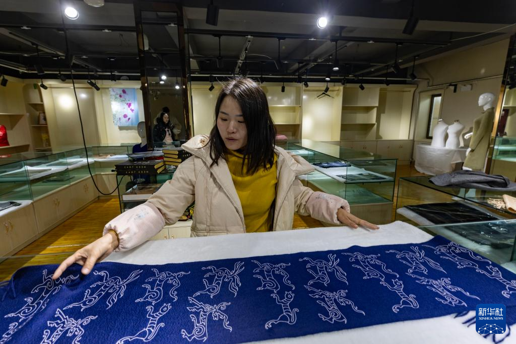 日土縣白山羊絨產(chǎn)業(yè)展示中心的工作人員在展示印有日土巖畫(huà)圖案的“指環(huán)披肩”(11月16日攝)。新華社記者 姜帆 攝
