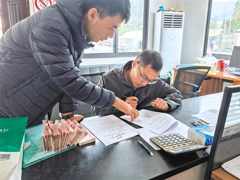 墨脫縣新創(chuàng)農(nóng)業(yè)科技開(kāi)發(fā)公司工作人員為波東村種植戶結(jié)算靈芝款。圖/文 記者 王珊 劉楓