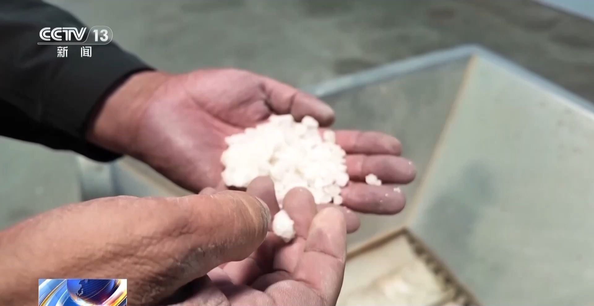 阿里地區(qū)革吉縣擦咔鄉(xiāng)黨委書記 貢覺(jué)次仁:這個(gè)就是足療鹽的原料,除了鹽以外還有很多藏藥,將原料先做初步的粉碎,然后進(jìn)行混合,最后磨成跟面粉一樣。