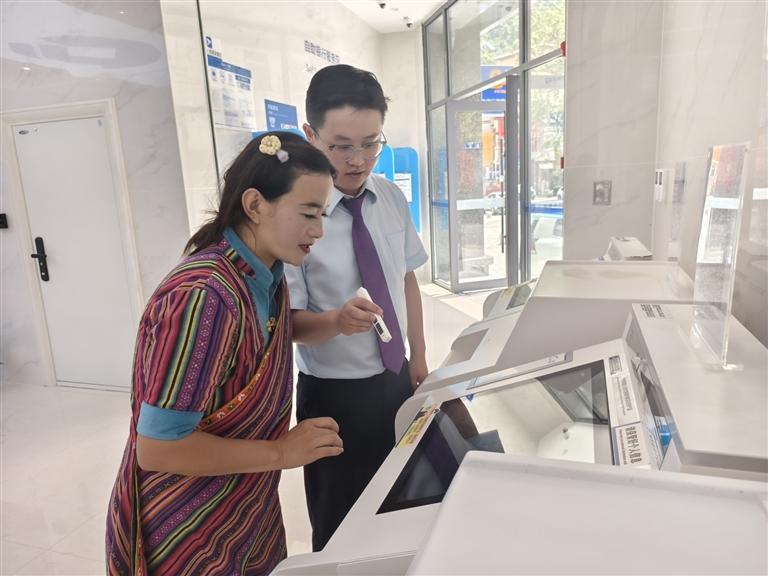中國(guó)建設(shè)銀行墨脫支行開(kāi)業(yè)當(dāng)天,工作人員成功為當(dāng)?shù)亻T巴族客戶在智慧柜員機(jī)上辦理首筆業(yè)務(wù)。