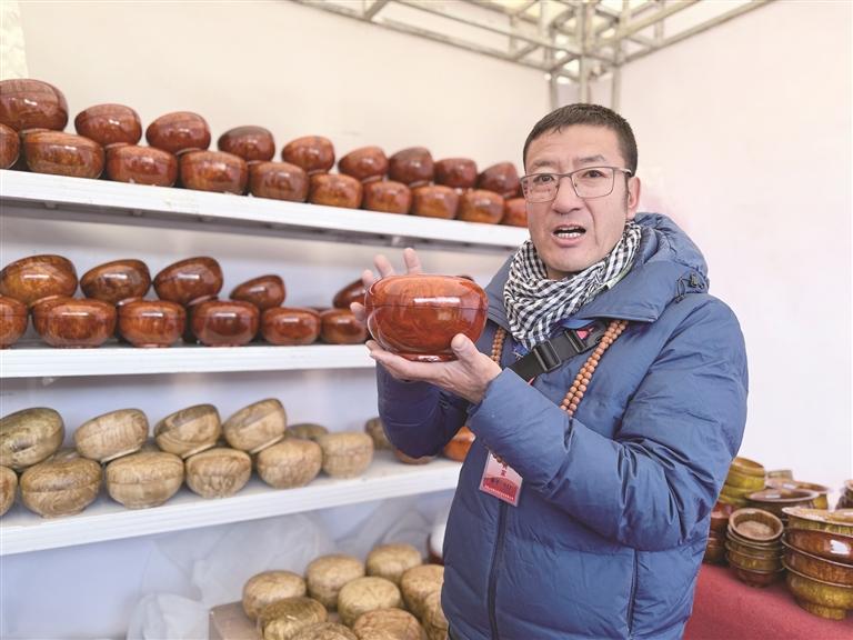 參展商戶們早早備好貨物,在展位前忙碌接待,不少人首日就收獲滿滿。不丹籍商戶扎西已是第二年參展,去年10萬元貨物售罄的好業(yè)績讓他今年信心倍增,帶來價值30萬元-40萬元的8個品種的產(chǎn)品,“物交會的人氣一年比一年旺,去年結(jié)識的本地合作伙伴今年還來進(jìn)貨,加上今年有物流補(bǔ)貼和線上推廣,我的木碗能賣到更遠(yuǎn)的地方,太省心了?!奔硬榭h商戶群培帶著自家手工制作的木碗連續(xù)參展20年,開幕僅一個多小時就入賬3000余元,他感慨道:“從跟著父親來擺攤到如今有了固定展位,物交會越辦越規(guī)范,如今不僅僅是本地顧客認(rèn)可我們的手藝,還有外地游客也會前來咨詢購買,生意越來越有奔頭。”