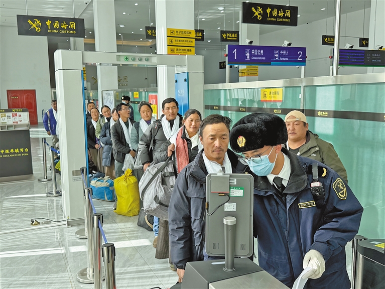 圖為拉薩海關(guān)所屬日喀則海關(guān)關(guān)員在里孜口岸開展監(jiān)管查驗(yàn)工作,確保旅客入境順暢。圖/文 記者 李梅英