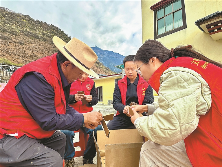 圖為墨脫縣格當(dāng)鄉(xiāng)黨員干部幫助村民制作包裝盒。記者 王敏 通訊員 郎玲 攝