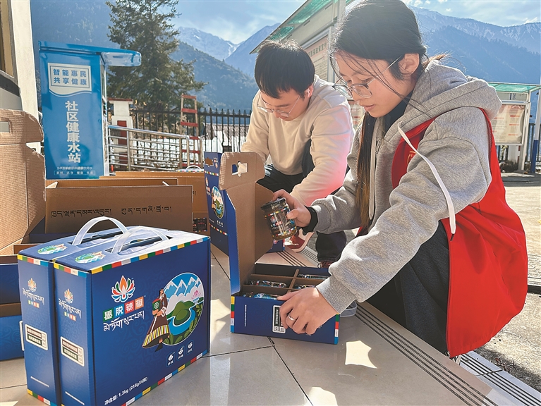 圖為墨脫縣格當(dāng)鄉(xiāng)黨員干部將辣椒醬裝箱。記者 王敏 通訊員 郎玲 攝