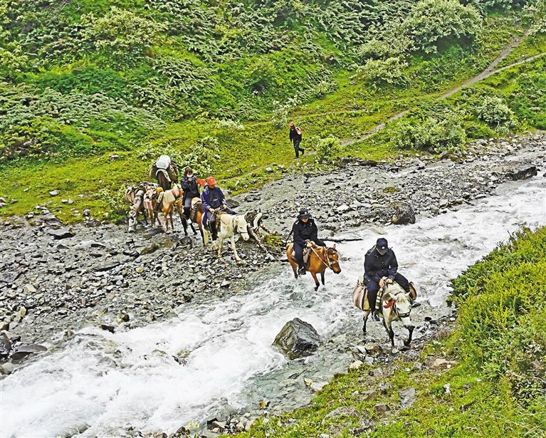 圖為貢當邊境派出所民警騎馬護送村民及物資前往冬蟲夏草采挖區(qū)。西藏日報記者 張宇 通訊員 季馨 攝