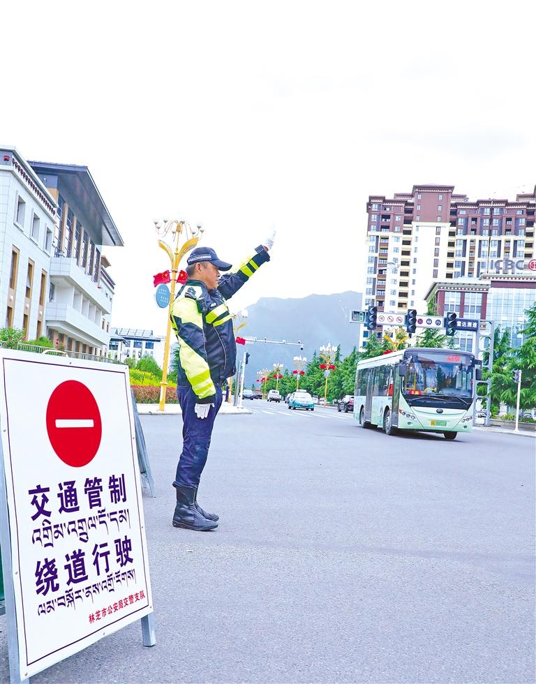 圖為林芝市公安交警在考場(chǎng)周?chē)笓]交通,維護(hù)安全有序的考場(chǎng)周邊交通環(huán)境。