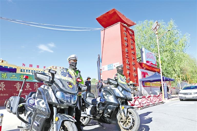 圖為日喀則市公安交警在考場(chǎng)外執(zhí)勤,為考生營(yíng)造安靜有序的考試環(huán)境。 本報(bào)記者 彭琦 攝