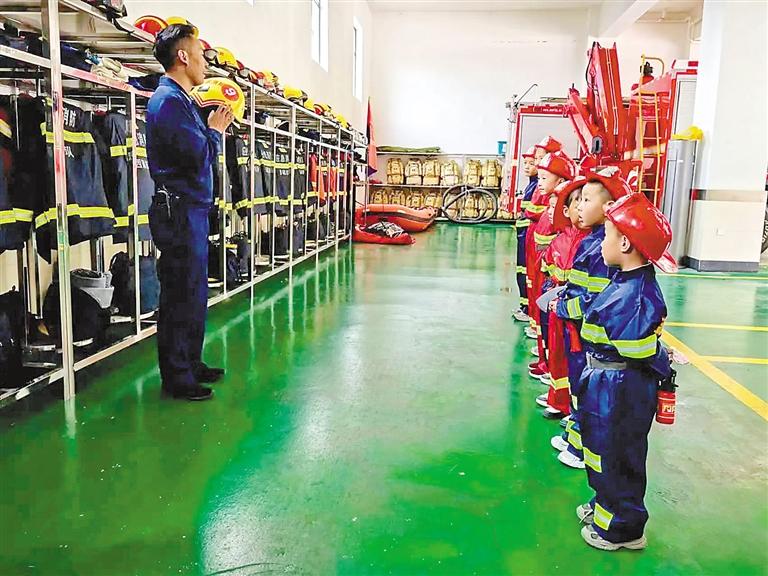 圖①:活動(dòng)中,消防員為孩子們講解防火安全常識(shí)。