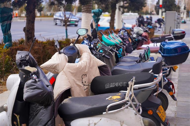 氣溫逐漸變冷,人們出行時紛紛全副武裝。不少騎電動車出行的市民選擇為愛車加裝“御寒神器”。在拉薩街頭,不少電動車都安裝了擋風被,其顏色、造型、款式各異,其中護膝型、套把型擋風被尤為常見。