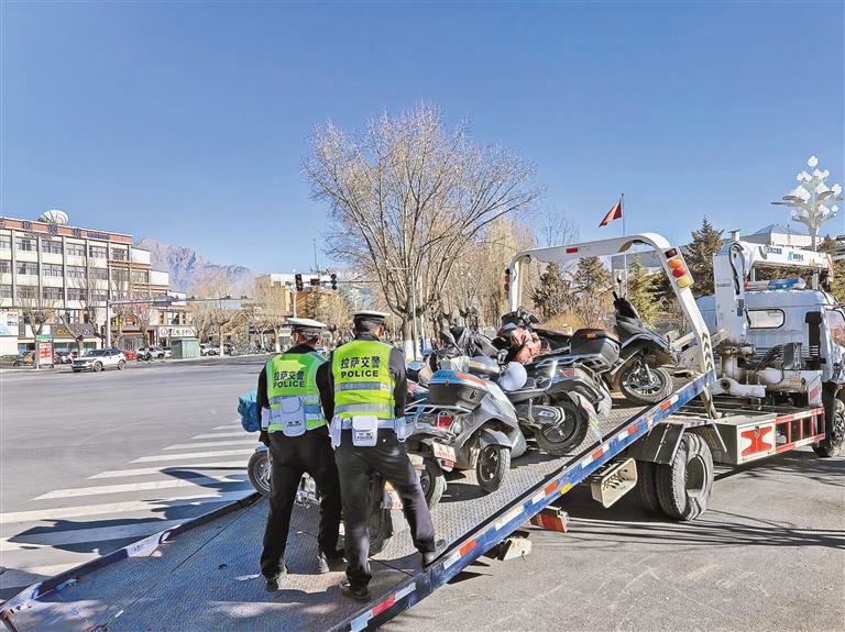 圖為拉薩交警正在清理超標電動車。