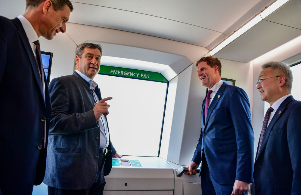 德國(guó)巴伐利亞州州長(zhǎng)索德爾(左二)一行體驗(yàn)中德合作的磁懸浮成都試驗(yàn)線。新華社記者張超群攝