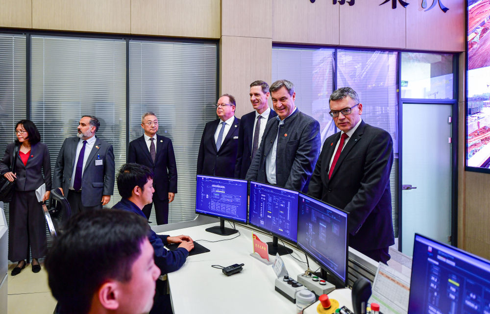 德國(guó)巴伐利亞州州長(zhǎng)索德爾(右二)一行來(lái)到中德合作的磁懸浮成都試驗(yàn)線列車運(yùn)控中心參觀。新華社記者張超群攝