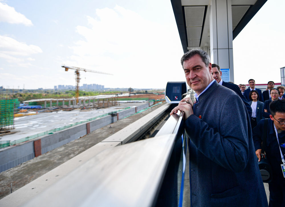 德國(guó)巴伐利亞州州長(zhǎng)索德爾在四川參觀中德合作的磁懸浮成都試驗(yàn)線。新華社記者張超群攝